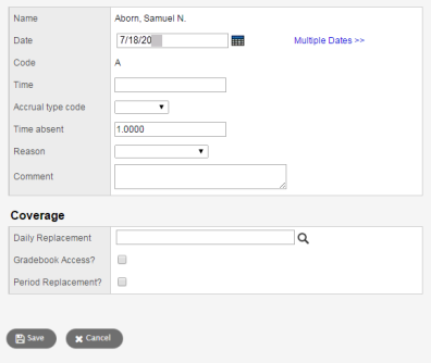 4. In the Coverage box, enter details about the teacher's replacement(s). You can assign: