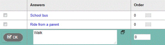 If you do not want your responses to appear in the order that you enter them, type a number representing the desired position. For example, to have a response appear second, type 2. You can also drag the options to appear in the order you want them. Click anywhere in the Order cell to do this.