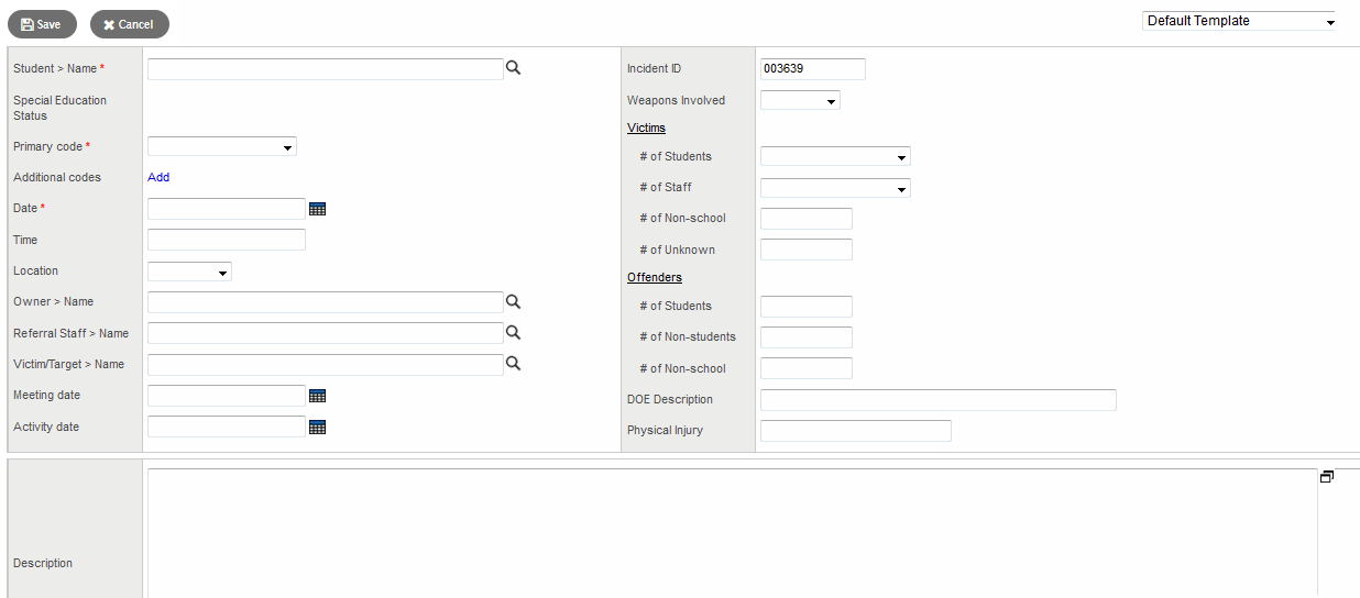 Detail pages in Aspen are called templates which contain several fields about a record. For example, the Conduct Incident Record detail page contains information on the selected student’s incident, such as the date, time, and location of the incident.