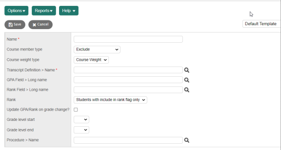 Warning: If you do not select a field, the system does not store student rank numbers in the Student table after you run the Grade Point Averages report with this definition, and the system cannot include GPAs on report cards and transcripts. To save student rank numbers, you must identify a field in which the system should save them.