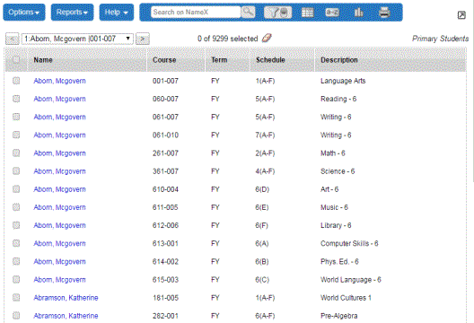 By default, Aspen displays the schedules in order by the student or teacher's last name. Each of the student or teacher's classes are listed separately: