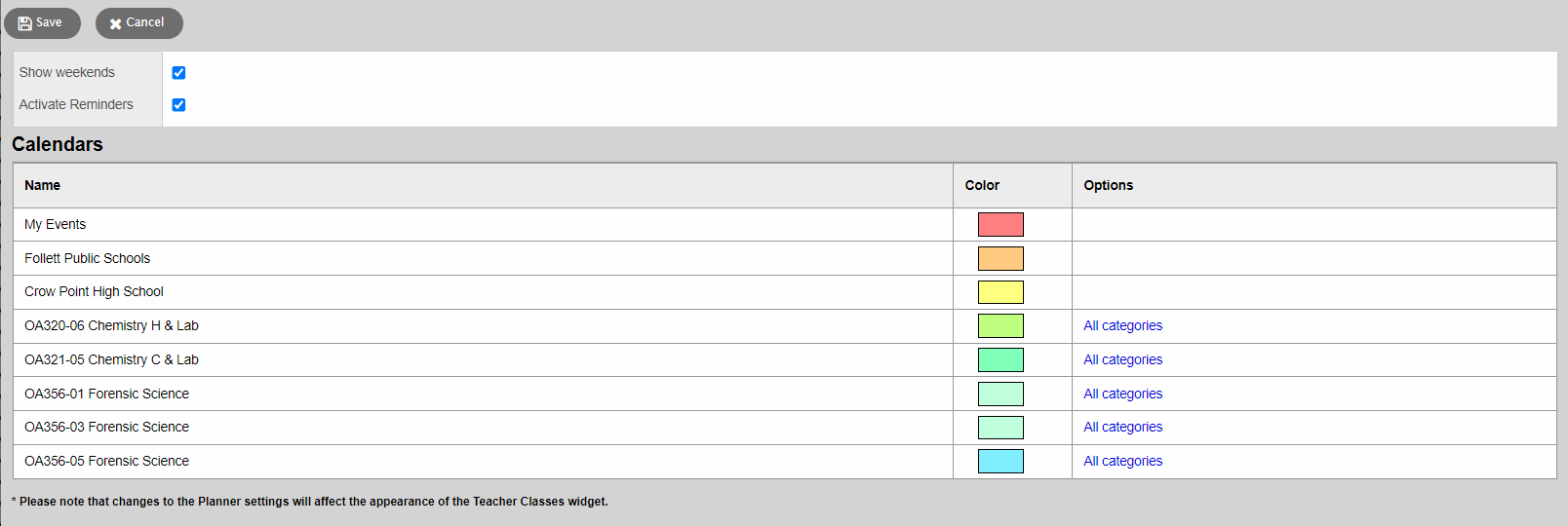 Note: Changes to the Planner settings will affect the appearance of the Planner widget. |