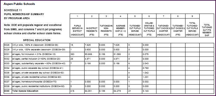 Note: Aspen does not calculate values for columns 7, 8, 9 or the Total Tuitioned Out FTE Membership column.
