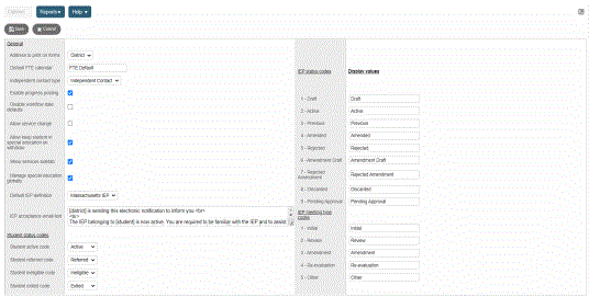 You can adjust the default values for student status codes, IEPClosed Individualized Education Program status codes, and IEP meeting type codes used in the Special Education view. For example, you can define that the status used for active special education students is Active.