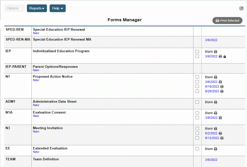 However, there may be times when an Aspen system administrator, special education manager, or case manager needs to manage the forms associated with the IEP, independent of the workflow. For example, you might need to hold an additional meeting that is not in the workflow. Using the Forms side-tab on the IEP tab, you can generate and print a new Meeting Invitation form.