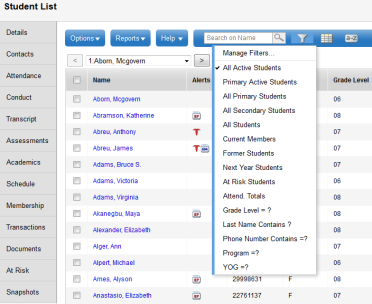 On the Student List, use the Filter menu Filter icon. to select All Active Students: